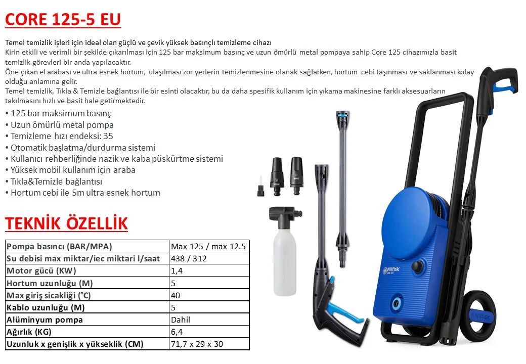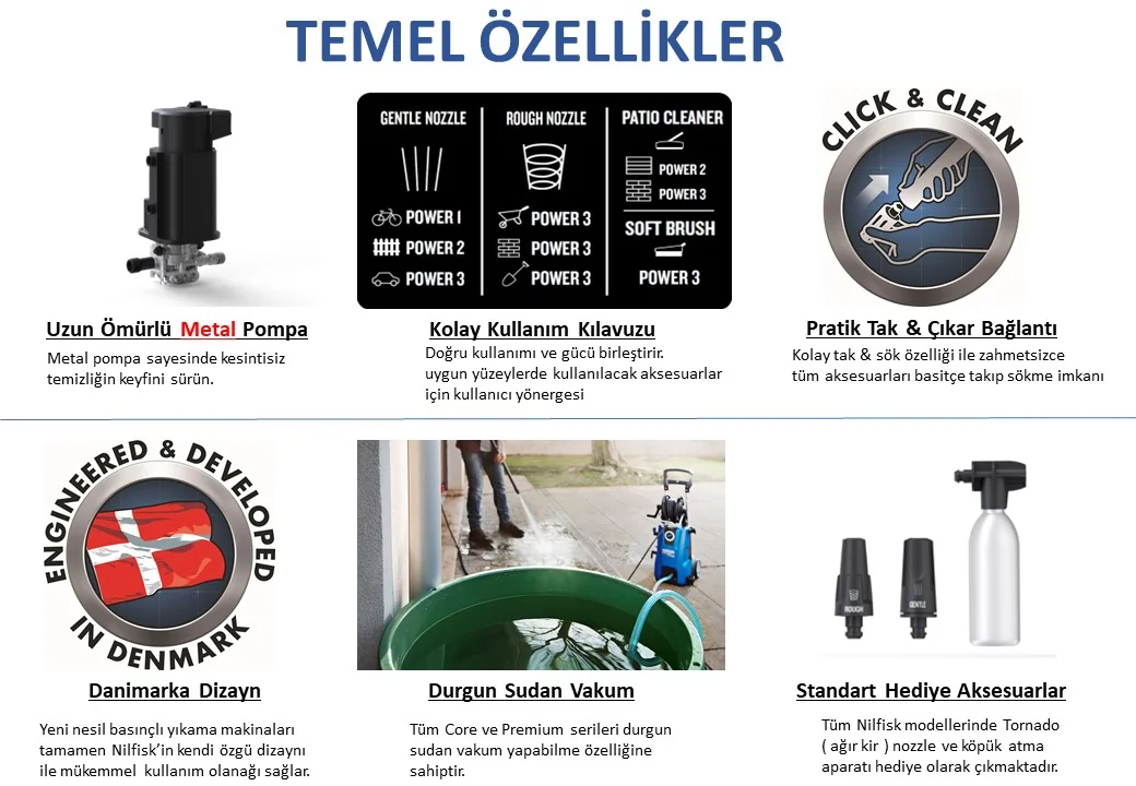 Bu zarif Nilfisk yüksek basınçlı yıkama makinesi, temizlik işlerinizi kolayca halleder.