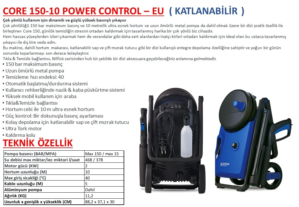 Çok yönlülüğü 150 bar maksimum basınç ve 10 metrelik ultra esnek hortum ve uzun ömürlü metal pompa da dahil olmak üzere bir dizi pratik özellik ile birleştiren Core 150, günlük temizliğin stresini ortadan kaldırmak için tasarlanmış harika bir çok yönlü biz cihazdır.